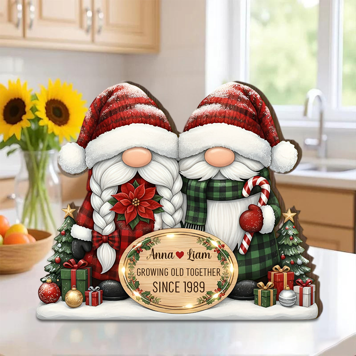 It's never too early to prepare for the warm and joyful charm of the Christmas season! This adorable personalized couple's figurine features a couple dressed in red and green Christmas-inspired attire and striped knit hats, and they huddled close together. Mini Christmas trees, gift boxes in various colors, Christmas balls adorn the surroundings, embodying the warmth and joy of Christmas. The wooden plaque at the base reads "GROWING OLD TOGETHER" conveying the beautiful sentiment of years of companionship and shared time. Commemorating long-lasting relationships, such as those between a couple, and incorporating Christmas elements, it adds a touch of warmth and joy to your holiday decor.