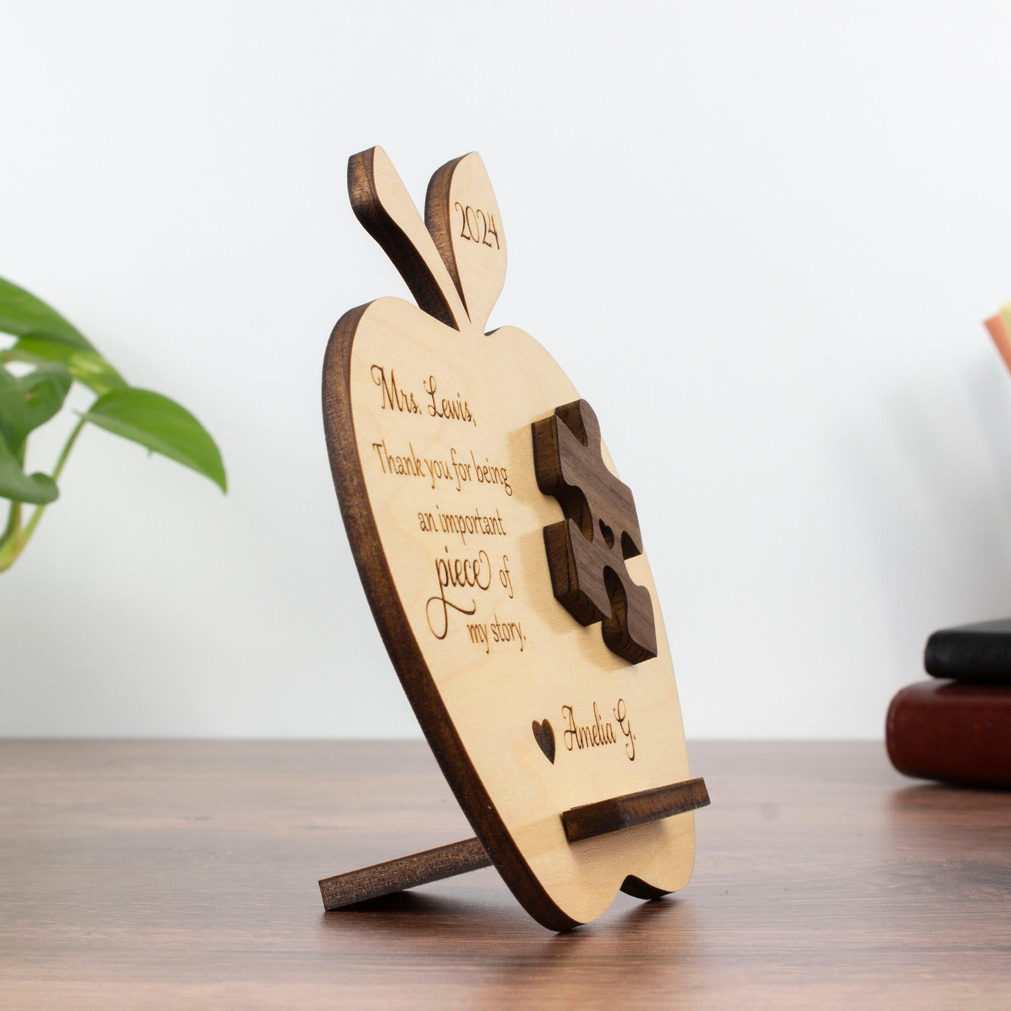 Teacher Appreciation Gifts personalized with the teacher and student's names. The mini apple sign with puzzle piece makes a cute teacher gift for end of year. The apple puzzle piece sign is symbolic and lets the teacher know how much you appreciate them. The desktop apple sign also makes for a great idea for daycare or preschool.