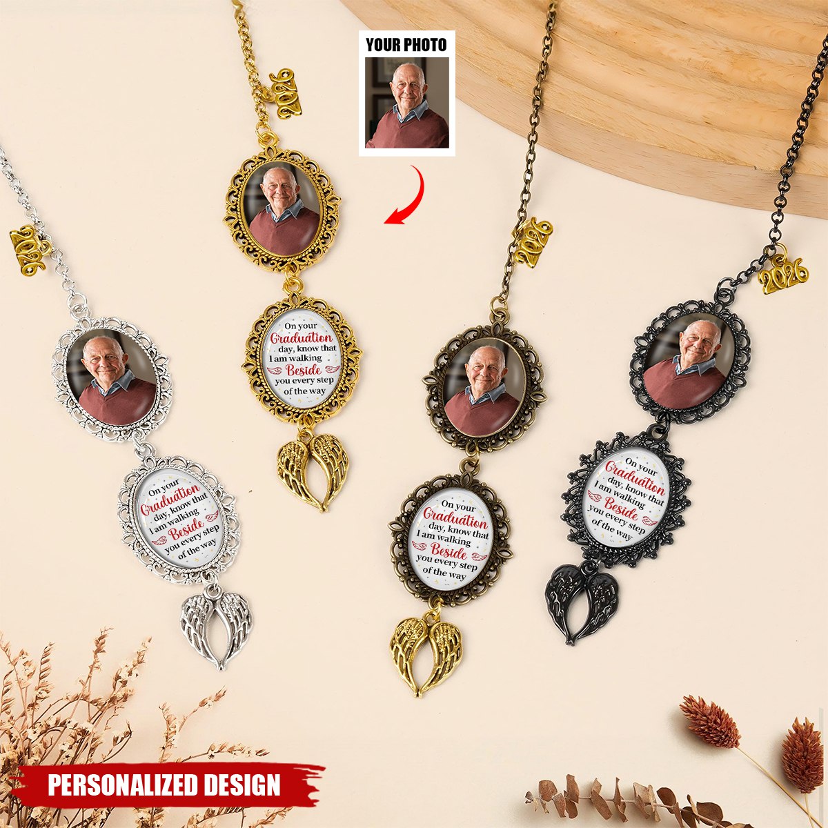 Celebrate your graduation while keeping the memory of your loved one close with this Custom Graduation Tassel Photo Charm. Engraved with the heartfelt message, "On your graduation day, know that I am walking beside you every step of the way." this charm is a beautiful reminder that love never fades and that your special someone is always with you in spirit.